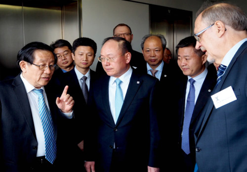 参观中,中方执行董事邓小军向万部长汇报了联合研发中心“复合材料应用技术研究”项目的实施情况。中车集团公司总经理马云双详细介绍了联合研发中心的目标定位、组织架构、总体建设情况以及项目合作实施情况,并汇报了联合研发中心作为高速列车国家技术创新中心的一部分,正进行开放式的协同创新体系构建,已开始先行先试,积极推进。中车总裁奚国华对万钢部长和科技部对中国中车科技创新工作的大力支持表示感谢,并指出,联合研发中心作为中国中车面向德国乃至欧洲聚合新技术的“桥头堡”,各方面建设已取得阶段性成果,已成为中国中车实施海外布局的重要组成部分,中国中车将持续支持联合研发中心的建设,为联合研发中心创新能力生成、创新成果转移和孵化,以及技术创新和产业链构建提供平台支撑,为高速列车技术引领世界做出贡献。