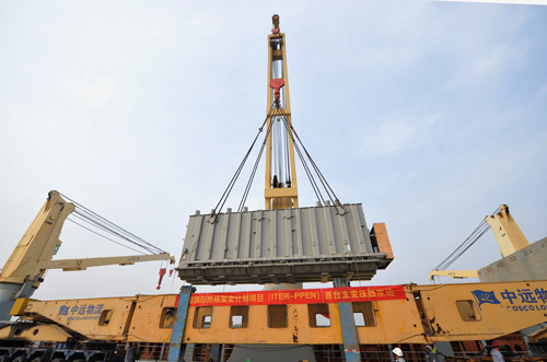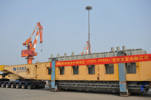 2016年4月17日上午8时30分,随着装载脉冲高压变电站 (PPEN)首台主变压器的货轮缓缓驶离天津临港,驶向ITER组织所在地法国,标志着ITER计划中方首个超大部件正式发运。