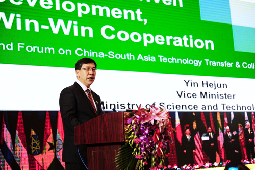 阴和俊副部长在主旨演讲中介绍了“十二五”期间中国科技创新取得的成就及“十三五”的科技创新思路,全面回顾了中国—南亚科技伙伴计划启动以来区域创新合作取得的进展。他强调,当前,新一轮科技革命和产业变革加速推进,科技助力经济社会发展成为国际共识,中国愿与包括南亚国家在内的“一带一路”沿线国家共享科技发展的经验和成果,共同打造“一带一路”创新共同体。为进一步发挥科技伙伴计划助力各国科技能力建设、支撑区域经济社会可持续发展的积极作用,阴和俊副部长就深化科技创新合作提出多项倡议,包括成立“一带一路”技术转移协作网络,与南亚各国扩大科技人文交流、夯实科技平台建设、开展科技创新政策交流与合作、强化合作研究等,以加强各国科技能力建设,促进区域产学研深入对接与融合,推动科技理念互通。