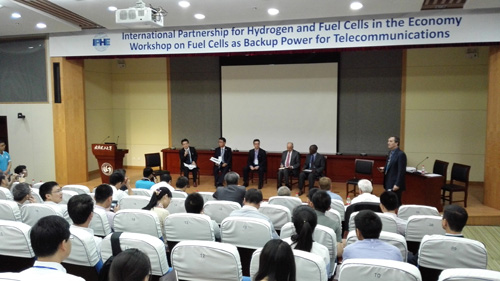 指导委员会会议结束后,国内外150余名氢能燃料电池专家还共聚一堂,举办了国际燃料电池备用电源技术专题研讨会。研讨会上,欧盟、美国、日本、南非、中国等政府代表介绍了各国及地区氢能燃料电池的发展战略和进展。巴拉德、普拉格、中兴电工等燃料电池制造企业和中国移动等用户企业就燃料电池备用电源在通信行业的应用现状及挑战进行了探讨。